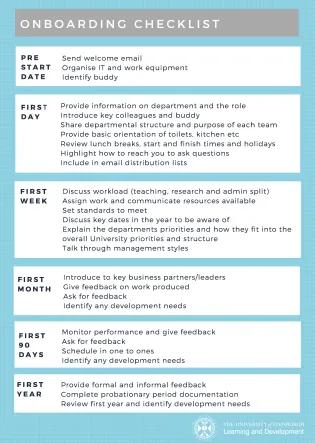 Welcome to the University of Edinburgh’s onboarding and induction support for managers. This guide offers checklists and essential information to effectively introduce your new staff to their roles and our university culture. Step 1. Understand your role. As a manager, new starts will look to you to welcome them to the University and support them as they settle in.Help them understand their job duties clearly and let them know what good work looks like.There's a lot for them to learn. Think about how to prioritise the information they need to know and when to give it to them.Introduce them to their team and key contacts early on to help them start making connections.Encourage them to join the New Staff Meet-Up sessions for even more networking opportunities.Follow these links for more detailed information and resources to help you with this: Making the most of your on-boarding pagesNew Staff Meet-Up sessions Support to offer in your new start's first year (available on this page) Step 2. Understand policies and support in place for you and your new start. New staff members should be made aware of the following policies at the start of their employment at the UniversityConflict of Interest Policy and Disclosure of Intimate Relationships PolicyNew staff members must understand when to disclose an intimate relationship or conflict of interest. As a manager, you will need to ensure that your new starts are informed about their obligations under the University’s Conflict of Interest Policy and Policy on Disclosure of Intimate Relationships during their induction.Reasonable Adjustments Policy and Guidance. This will prepare you to support staff who require reasonable adjustments to perform their best.Support – understanding our culture and valuesStaff induction represents a valuable opportunity for line-managers to introduce our values, behaviours, and culture. This helps foster a positive and inclusive working culture, where individuals are treated with dignity and respect and instances of bullying, harassment or discrimination are not tolerated. Talk through Equality, Diversity and Inclusion policiesExplain ways of working that are available when working with others, both online and face-to-face. Communication and Collaboration ToolsFor more detailed information on your responsibilities as a manager, please read through the Document Information for Line Managers (279.69 KB / PDF) Find these policies and all our HR Policies on the A-Z HR Policies page Step 3. Use the following checklists and guides. Document Sample Pre-Employment Checklist and Welcome Letter (can be adapted by department) (70.74 KB / DOCX) Document Sample New Staff Checklist for first few months in post (can be adapted by department) (76.95 KB / DOCX) Document Buddy Guidance (64.6 KB / DOCX) The following document provides you with an overview of support your new start may benefit from during their first year in post. Document Support to offer in your new start's first year (102.38 KB / PDF) Step 4. Familiarise yourself with the required induction training and learning available to your new start. A full list of required learning and role and career development support available can be found in Steps 4 and 5 of the on-boarding webpage.Making the most of your on-boarding pages Step 5. Follow probation guidance for the duration of their probationary period Staff on Probation Additional Information This article was published on 2024-09-23